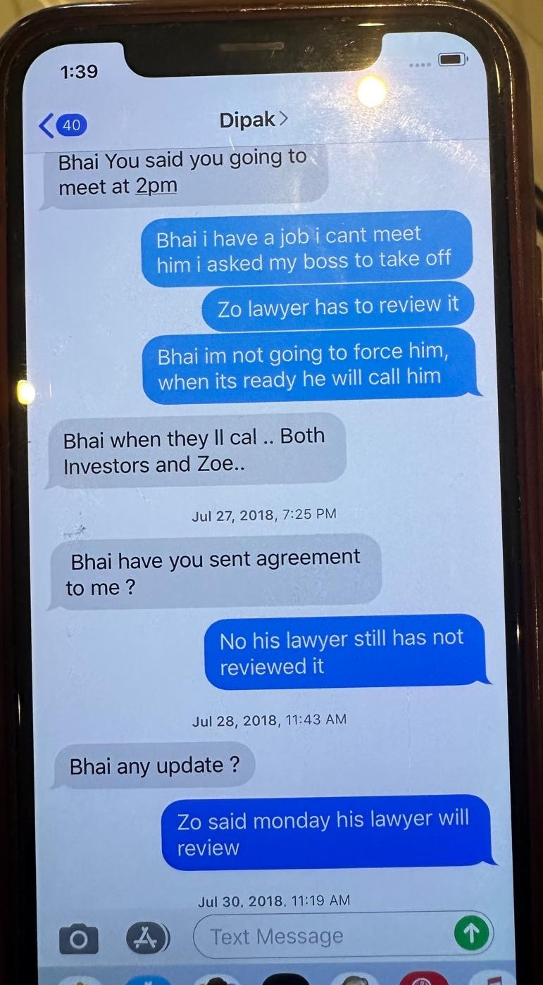 Furthermore, text messages reveal that Dipak is communicating with Patel about an individual referred to as “Zoe” who is one of the people Patel has allegedly stolen the identity of. However, it is unclear from the texts whether Dipak is aware that Patel is impersonating “Zo” or “Zoe” on the phone. It’s possible that Patel is being deceptive even with those who are helping him.